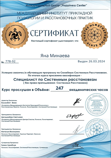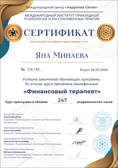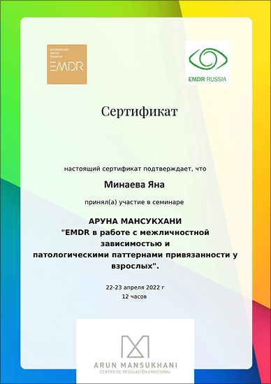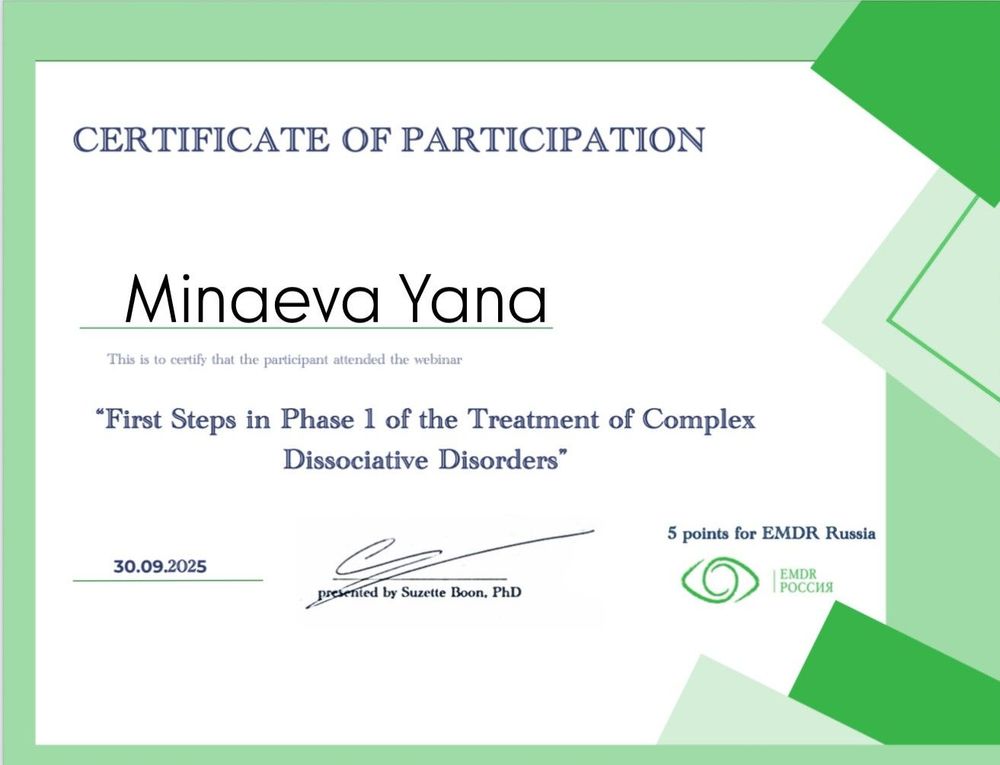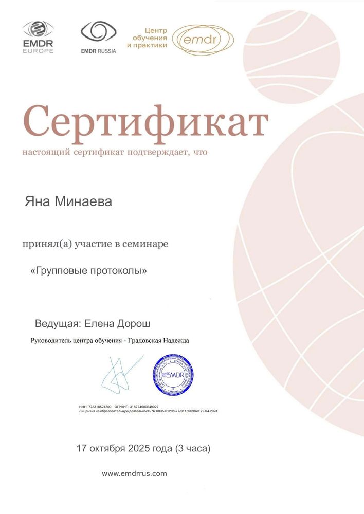 Я — сертифицированный специалист, постоянно обучаюсь, прохожу супервизии и личную терапию.